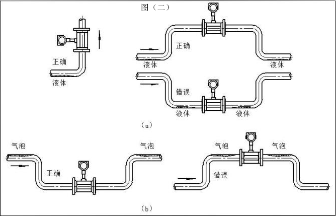 為了防止氣體進(jìn)入儀表測(cè)量管,儀表應(yīng)安裝在管線的較低處如圖(二)b 所示;